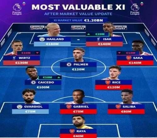 雷速体育10月18日宣 德国转会市场于近日更新了英超联赛的球员市值,并列出了一个阵型为3-5-2的最贵11人阵容。在这个总身价高达12亿欧元的阵容中,阿森纳有5名球员入选,切尔西、利物浦、曼城则分别有2人入选。