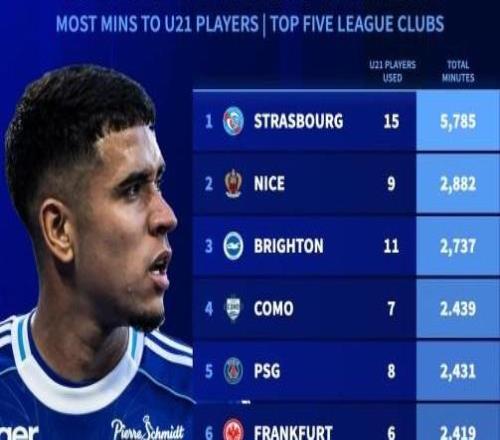 北京时间10月16日,德转统计出了本赛季至今欧洲五大联赛俱乐部U21球员的出场时间排行榜,斯特拉斯堡15名球员共计出场5785分钟高居第一,巴黎圣日耳曼、切尔西以及皇家马德里也都