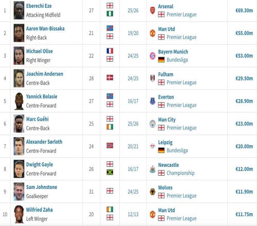 水晶宫队史卖人榜:埃泽、万比萨卡、奥利塞前3,格伊第6