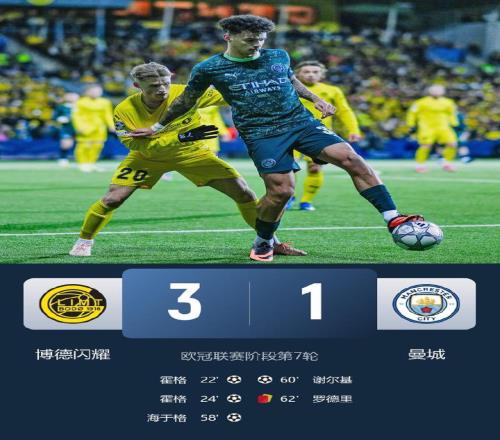 北京时间1月21日1:45,欧冠联赛小组阶段第7轮开打,英超豪门曼城客场对阵博德闪耀。此役哈兰德延续低迷表现,罗德里吃到红牌,博德闪耀球员卡斯帕-霍两分钟两球,海于格打进世界波,曼