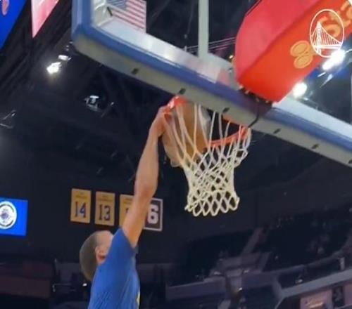 雷速体育10月18日讯 NBA季前赛继续进行,勇士将在今天的季前赛收官战中主场迎战快船。赛前热身环节,库里展示花活儿。 他以一个排球式助攻,让自己完成了自抛自扣。